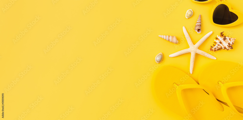 Summer time concept, top view with copy space of flip flops and sunglasses with starfish on yellow background.