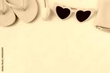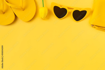 Summer time concept, top view with copy space of flip flops and sunglasses with lily on yellow background.