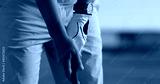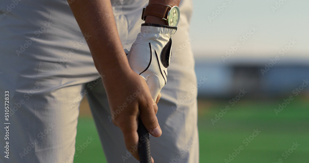 Golf player hands swing hold putter club on green course. Man play sport outside