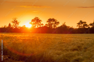 beautiful landscape of cereal field, silhouettes of trees in the light and sunset