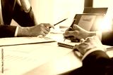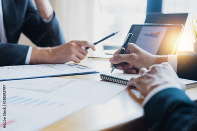 close up hand of legal and businessman advisor, two business people talking, planning analyze investment and marketing on tablet in office..