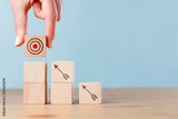 Business woman putting to arranging wood cube with arrow stacking step stair to target