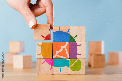 Woman hand putting the last piece of wooden blocks with the light bulb icon