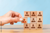 Human resource management and team building in the business. Woman hand picking different human head symbol. .