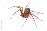 Closeup picture of a female of the Mediterranean recluse spider Loxosceles rufescens (Araneae: Sicariidae), a medically important spider with cytotoxic venom photographed on white background.