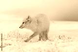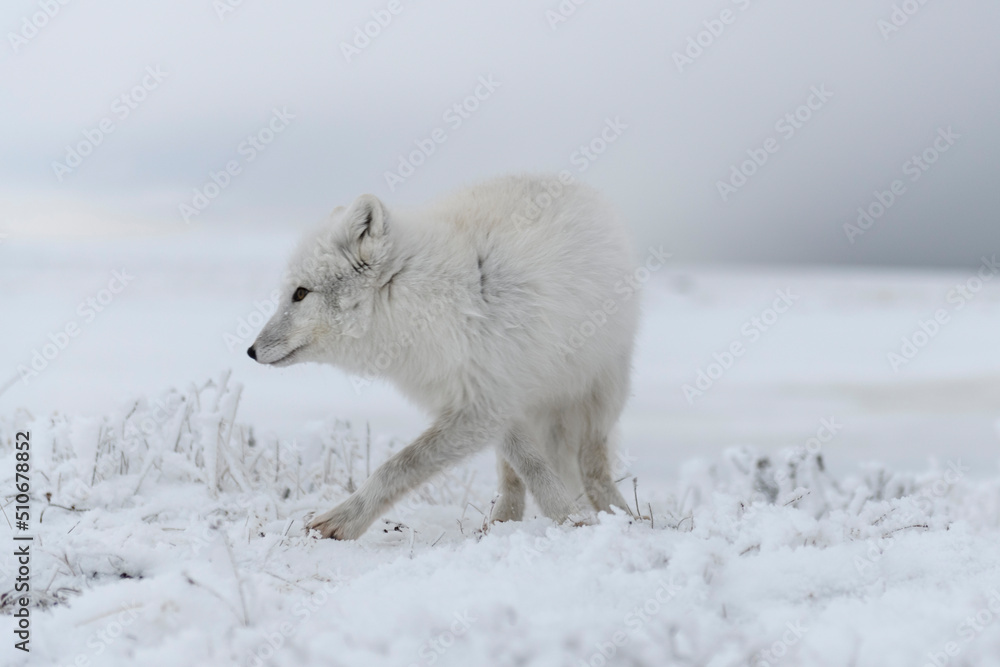 Wild arctic fox (Vulpes Lagopus) in tundra in winter time. White arctic fox.