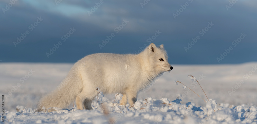 Wild arctic fox (Vulpes Lagopus) in tundra in winter time. White arctic fox.