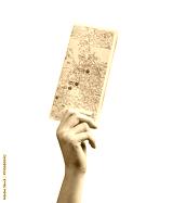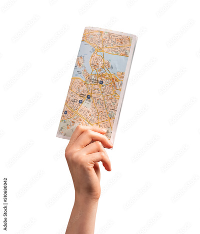 Woman hand holding tourist map, guide isolated on white background. Travelling, going to trip, visiting places of interests, attractions concept. High quality photo