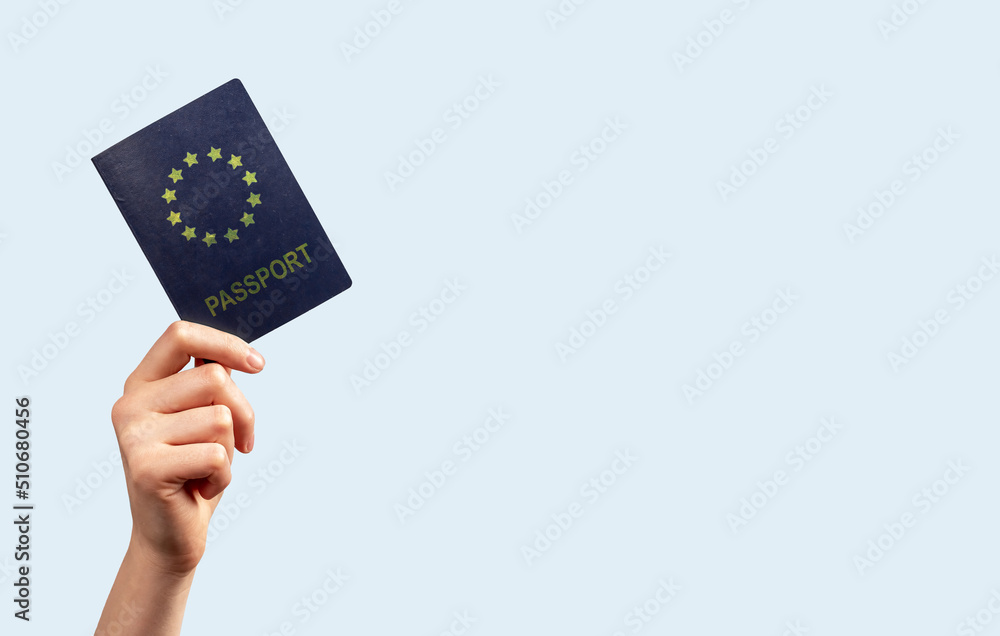Banner with woman hand holding passport on blue background. Female with travel document. Identity, nationality verification. Place for text. High quality photo