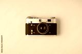 Old retro camera on the yellow background. Stylish background for a photo enthusiast. Flat lay