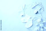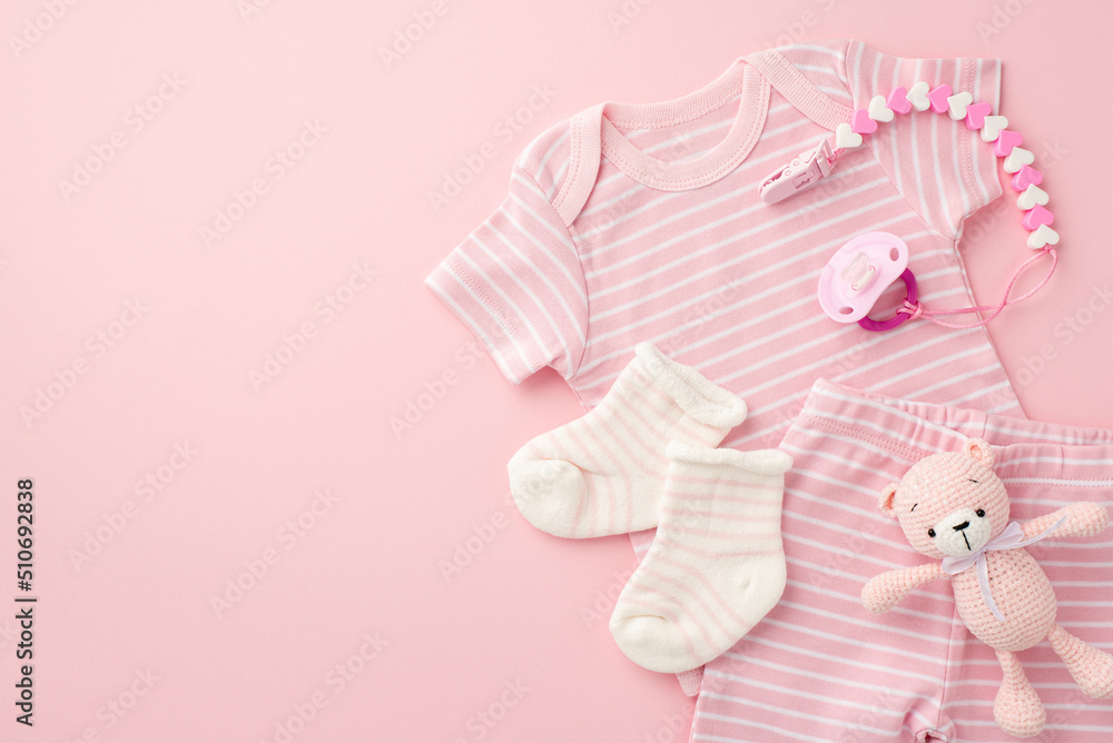 Baby accessories concept. Top view photo of pink infant clothes shirt shorts socks knitted teddy-bear toy and pacifier chain on isolated pastel pink background