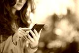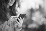 Elegant woman at home in sunny day using phone applications