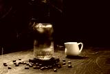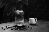 Cold espresso tonic. A highball glass filled with ice cubes, tonic soda water, coffee beans around, milk jug, wooden background