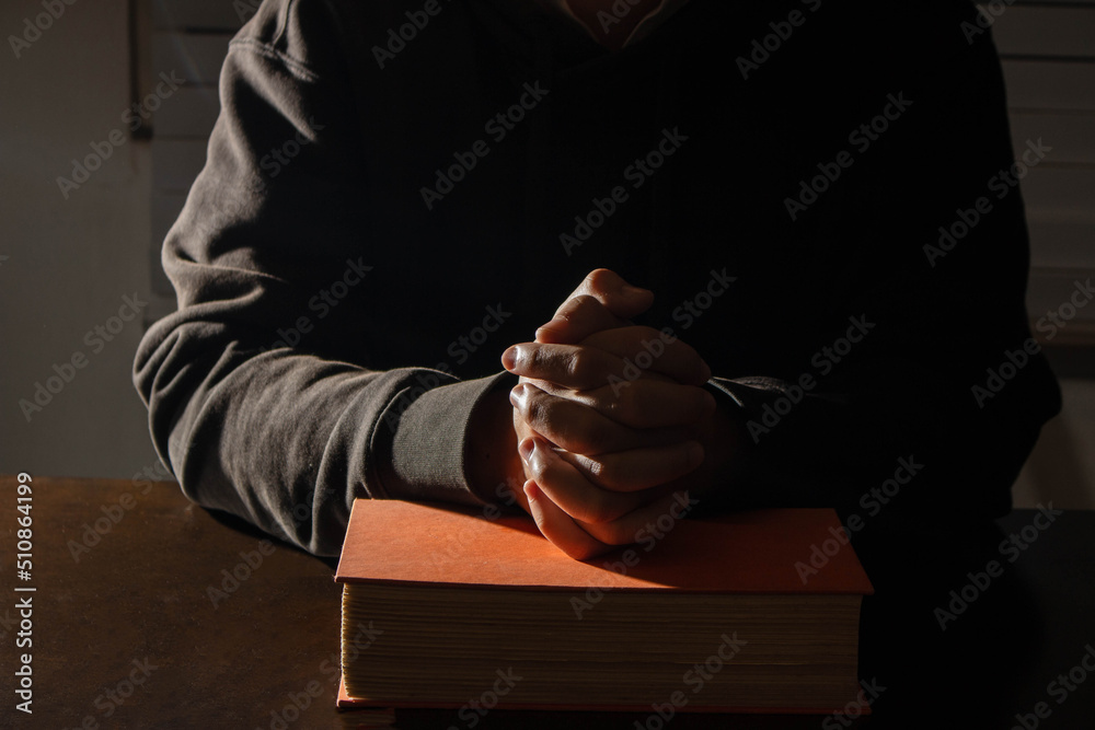 Religion concept, Young asian man reads bible and hands folded to prayer for faith and spirituality