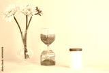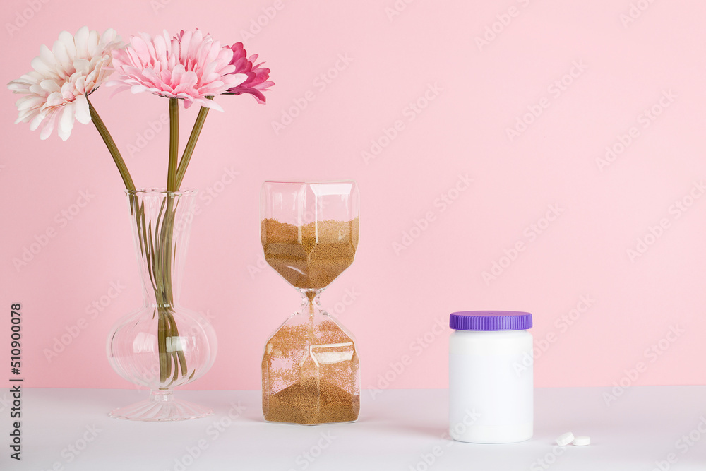 women health, middle age and menopause concept. health care style. copy space. white plastic bottle with pills, flowers, hourglass on pink background
