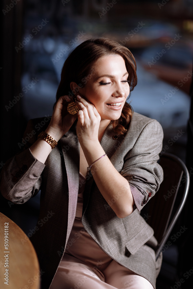 portrait of fashion young woman with hairstyle wearing in polka dots shawl and gloves with makeup posing. Brunette woman in dark jacket outdoors looks in camera