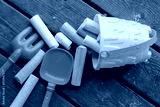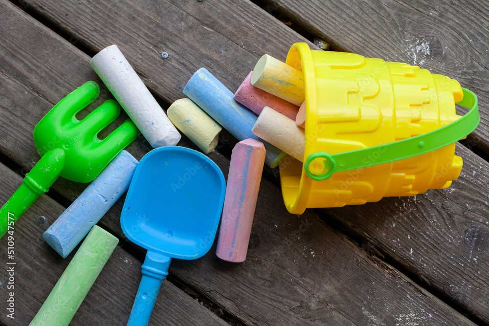 Children sand bucket holding colourful chalks and toy shovel spreading on floor. Children play scene.