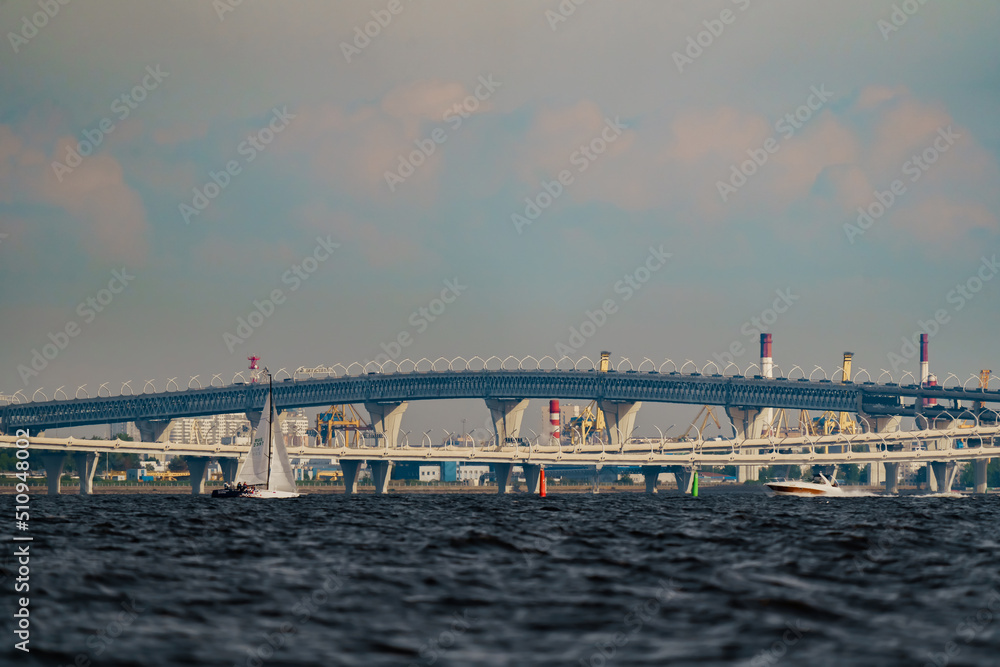 Sailing yachts on background of highway, bulk island, construction cranes, pipes of the thermal power plant
