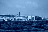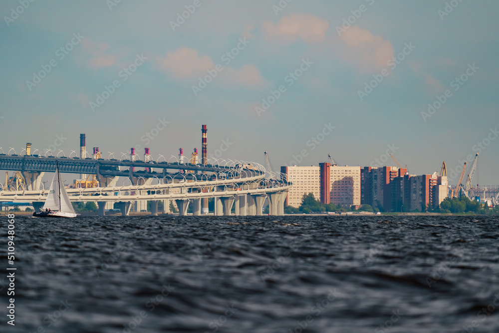 Sailing yachts on background of highway, bulk island, construction cranes, pipes of the thermal power plant