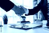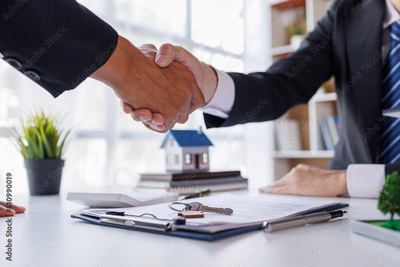 Handshake Real estate brokerage agent Deliver a sample of a model house to the customer, mortgage loan agreement Making lease and buy and sell house And contract home insurance mortgage loan concept