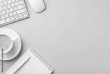 Business concept. Top view photo of workspace keyboard computer mouse open planner pen and cup of frothy coffee on saucer on isolated pastel blue background