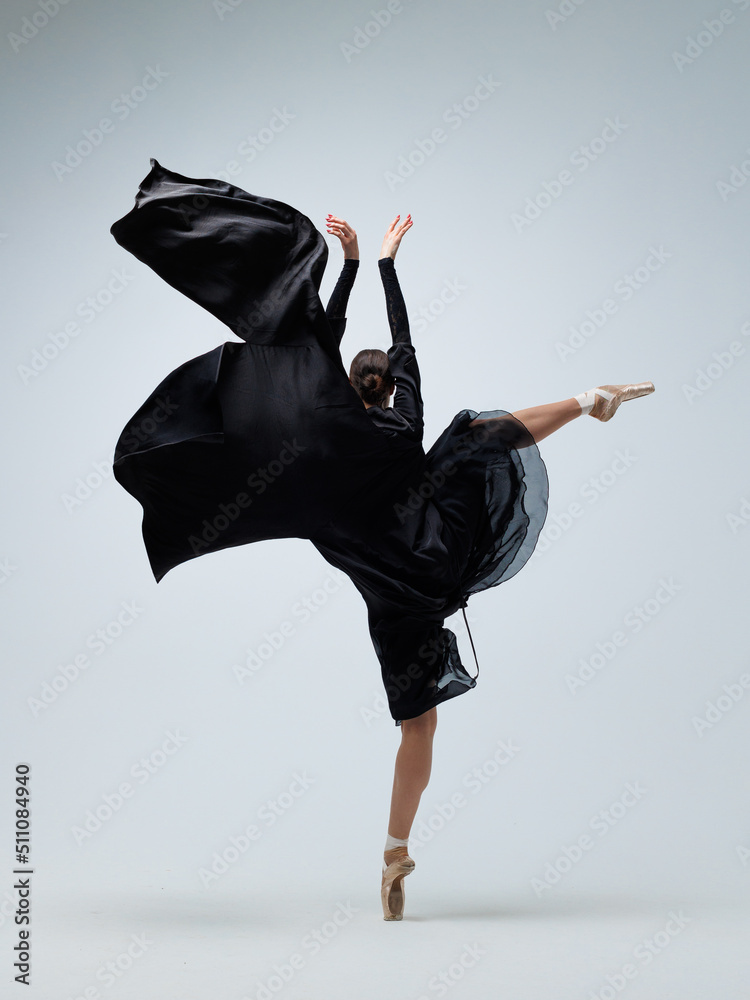 Elegant ballerina. A young graceful ballet dancer, dressed in pointes shoes demonstrates her dance skills. Power and refinement of classical ballet.