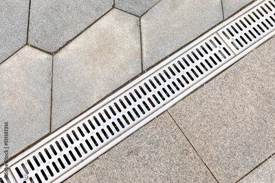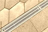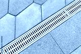 Gutter, drain for rain water on the sidewalk in the park. Drainage systems on paving slabs. Sidewalk construct