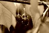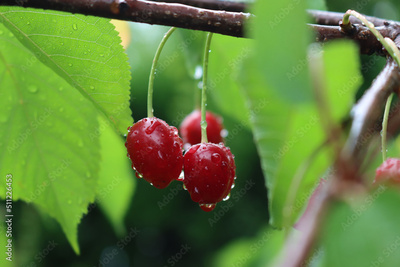 Red ripe cherry fruits on branch covered by raindrops after a rain in the orchard. Prunus avium on springtime