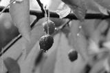 Red ripe cherry fruits on branch covered by raindrops after a rain in the orchard. Prunus avium on springtime