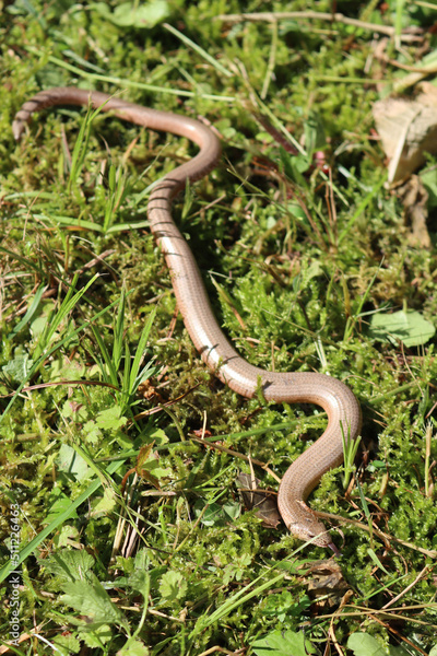 Twisted slowworm on green grass on a sunny day. Anguis fragilis