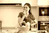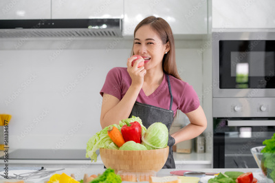Asian women smiling in kitchen cooking salad vegetable eat healthy