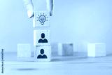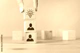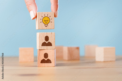 Woman hand picked wooden cube block with head human symbol and light bulb icon. Creative idea and innovation.