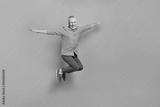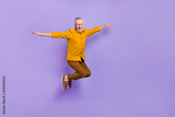 Full body photo of cheerful aged man have fun hands wings airplane isolated over purple color background