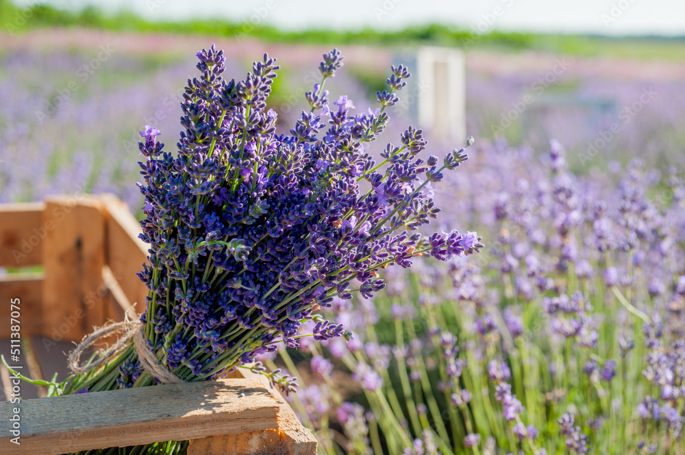 bouquet of lavender on a white wooden box, time of cutting and harvesting