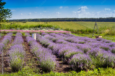 lavender field and agricultural behind, summer landscape