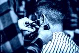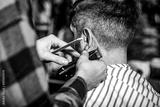 Hands of barber with hair clipper, close up. Haircut concept. Hipster client getting haircut. Black and white
