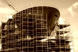 Shipbuilding and crane during ferry construction surrounded by scaffold