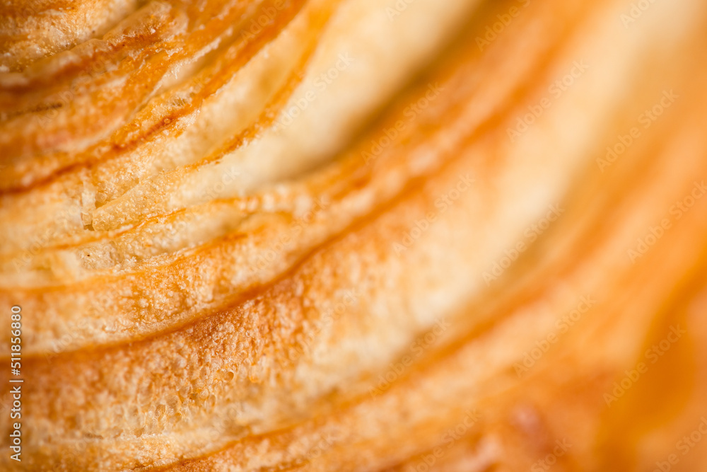 Croissant macro. French croissant with waves. Air baking. Croissant for puff pastry advertising. Croissant for a magazine.French breakfast with pastries. From puff pastry. Bun from France. Roll macro