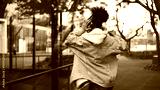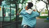 Smiling African girl with ponytail wearing denim jacket, in crop top with national pattern walking down the street listening to music on headphones and dancing