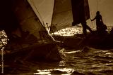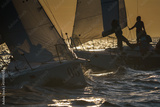 Teamwork in sailing regatta at sunset, still water, the clear sky, hot racing