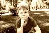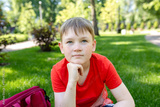 portrait of 10 years old schoolboy outdoors. freckled boy sitting on a green lawn in summer. Casual wear, a look above the camera