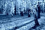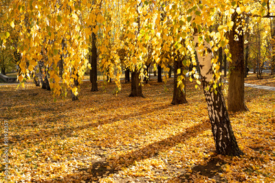 Yellow birches in autumn park at sunset. Fall season