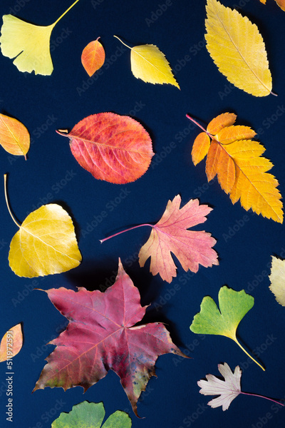 Colorful various autumn fallen leaves on a dark black background. Seasonal background and texture. Top view, flat lay