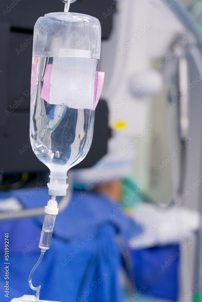 Normal saline solution or sodium chloride with infusion bottle drip for patient in hospital, Intravenous system of operating surgeons.
