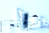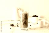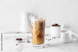 Glass of delicious cold brew with milk and coffee beans on white marble table