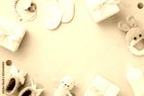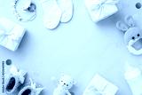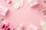 Baby girl concept. Top view photo of gift boxes socks booties knitted bunny rattle toy teddy-bear pacifier chain bottle and confetti on isolated pastel pink background with copyspace in the middle
