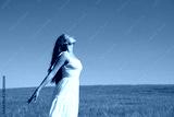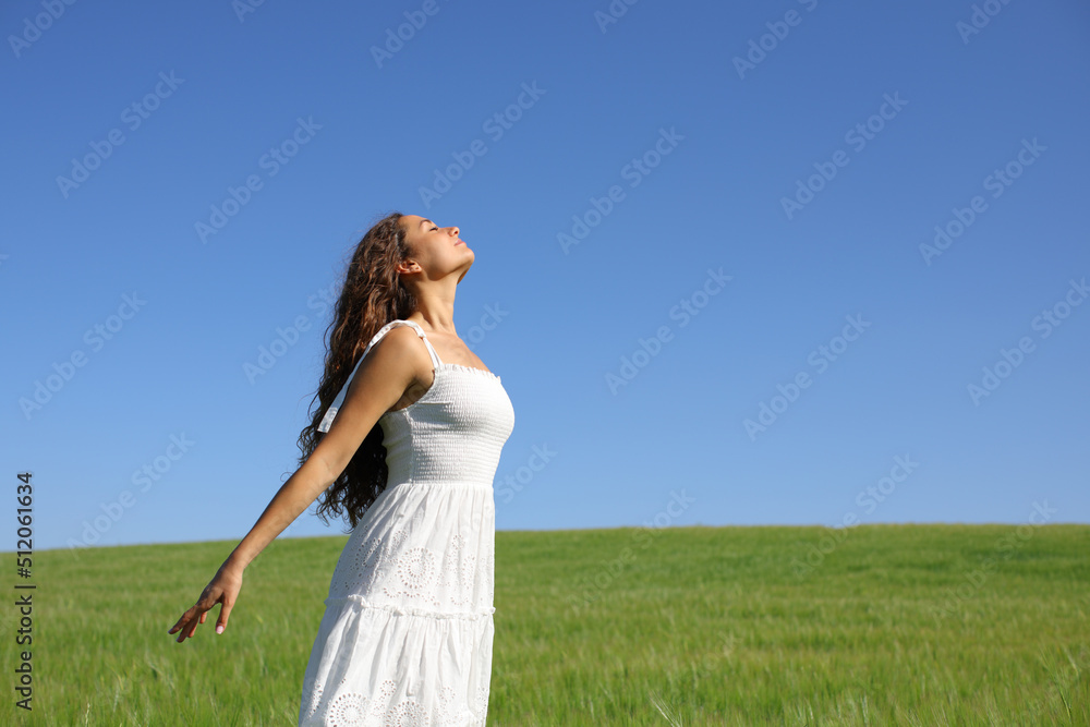 Woman in white dress breathing fresh air in a field