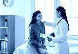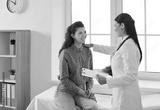 Friendly smiling female doctor touches patient's shoulder and tells her good news. Joyful young woman sitting on couch in doctor's office during medical examination and talking to doctor.
