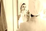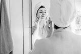 Woman in bathrobe with a towel on head looking in mirror, exfoliating facial skin with loofah sponge, removing makeup or doing cleansing routine, skincare treatment concept. Home Beauty self-care.