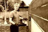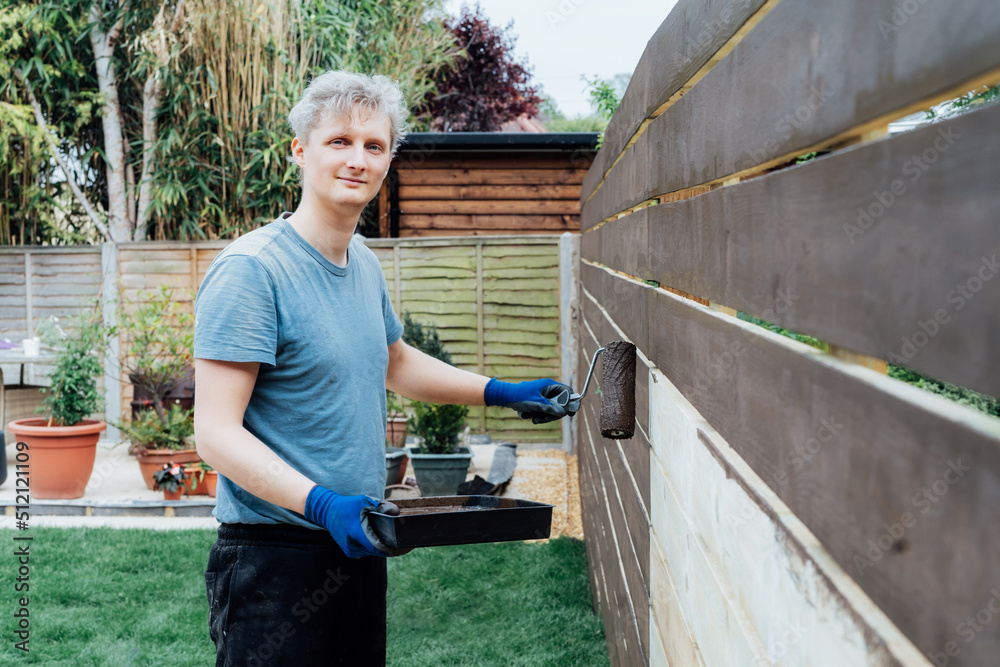 Portrait of young man worker paints with a roller a wooden board fence in the garden. DIY, Do it yourself concept. House improvement. Home renovation and refurbishment. Selective focus, copy space.